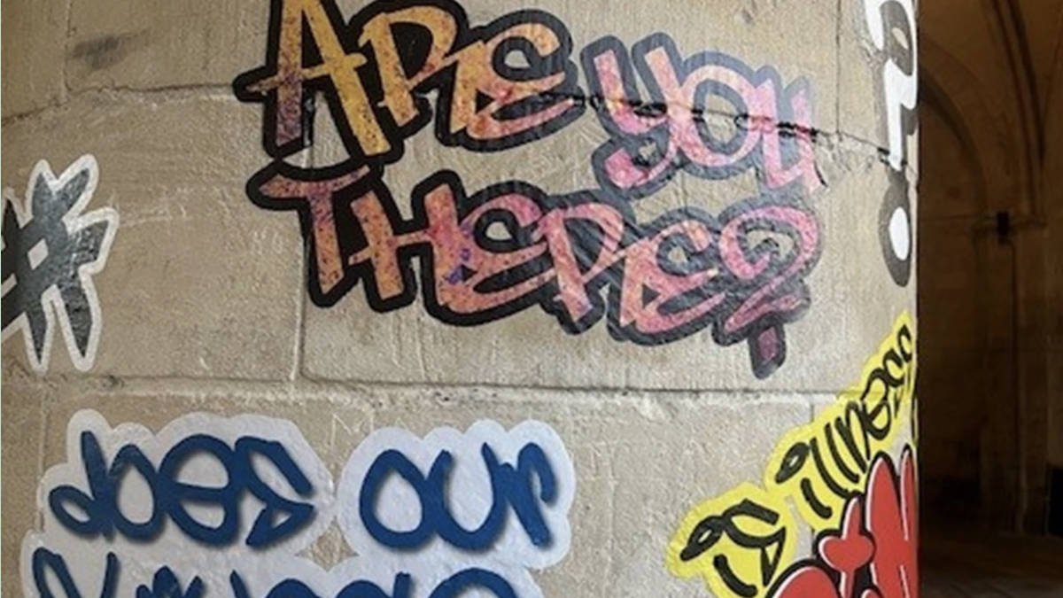 Questions such as “Are you there?” and “God, what happens when we die?” have been splattered in bright colours across the walls of the building, founded in 579 AD.