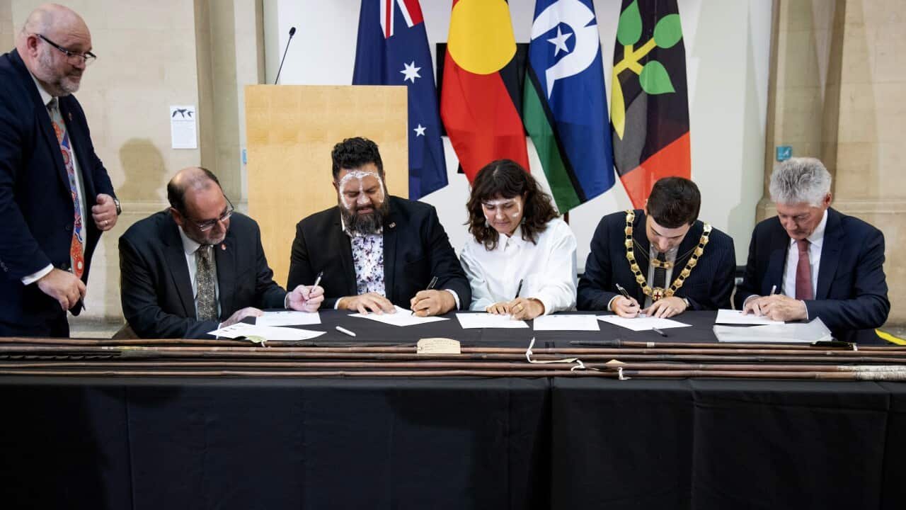 Larrakia representatives, Nigel Browne and Mikayla Lee attended the return ceremony at the Bristol Museum and Art Gallery in the UK. Source: Supplied / ©Bristol Design, Bristol Museum & Art Gallery
